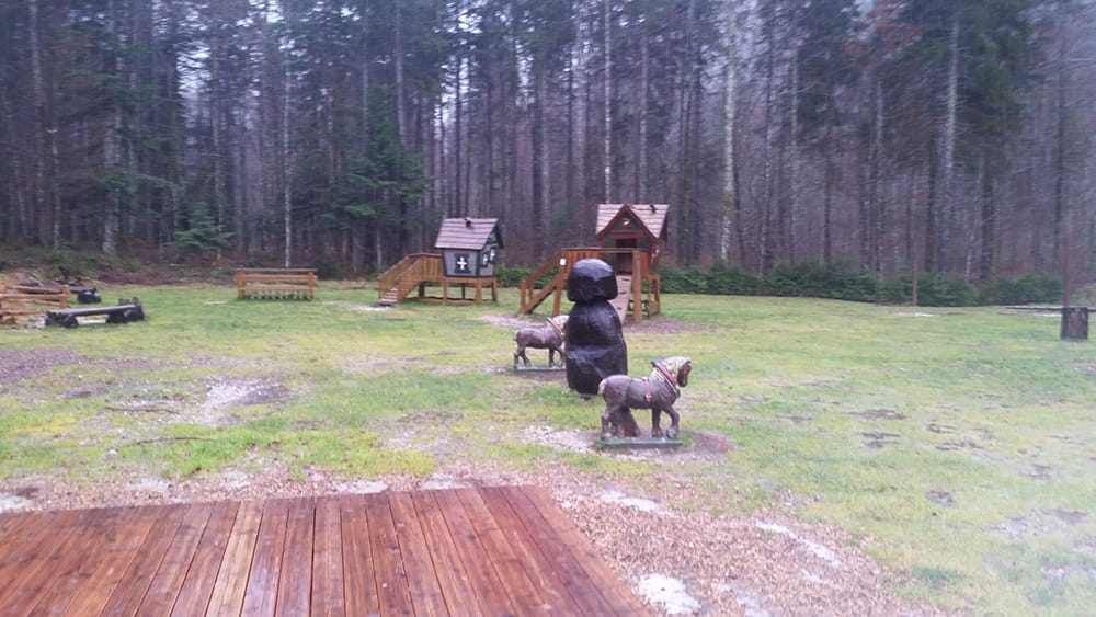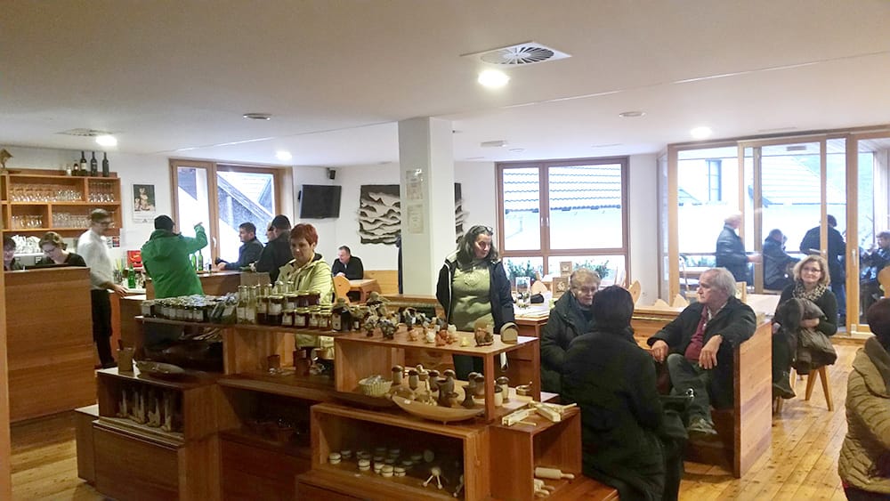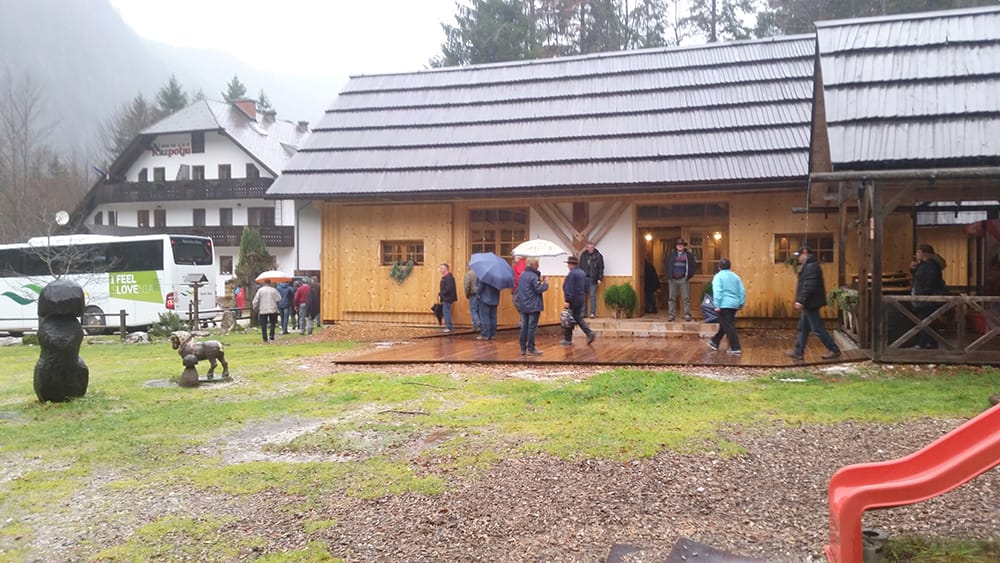 Naslednji postanek je bil v penzionu Na razpotju. Avtobus je parkiral tik pred vhodom v brunarico, ki je namenjena pogostitvi zaključenih skupin. Gostiteljica penziona Andreja nas je prijazno sprejela in nam na kratko predstavila njihovo zgodbo in pravljični vrt, ki je namenjen otrokom. Zunaj je še kar naprej deževalo, z okoliških pobočij so padali številni slapovi, v brunarici opremljeni v domačem stilu pa je bilo prijetno toplo. Postregli so nam z okusno gobovo juho z ajdovimi žganci ter sočnim golažem. Najprej pa je na mizi zmanjkalo slastnega doma pečenega kruha. Na koncu smo se posladkali še z babičinim zavitkom polnjenim s skuto in malinami.