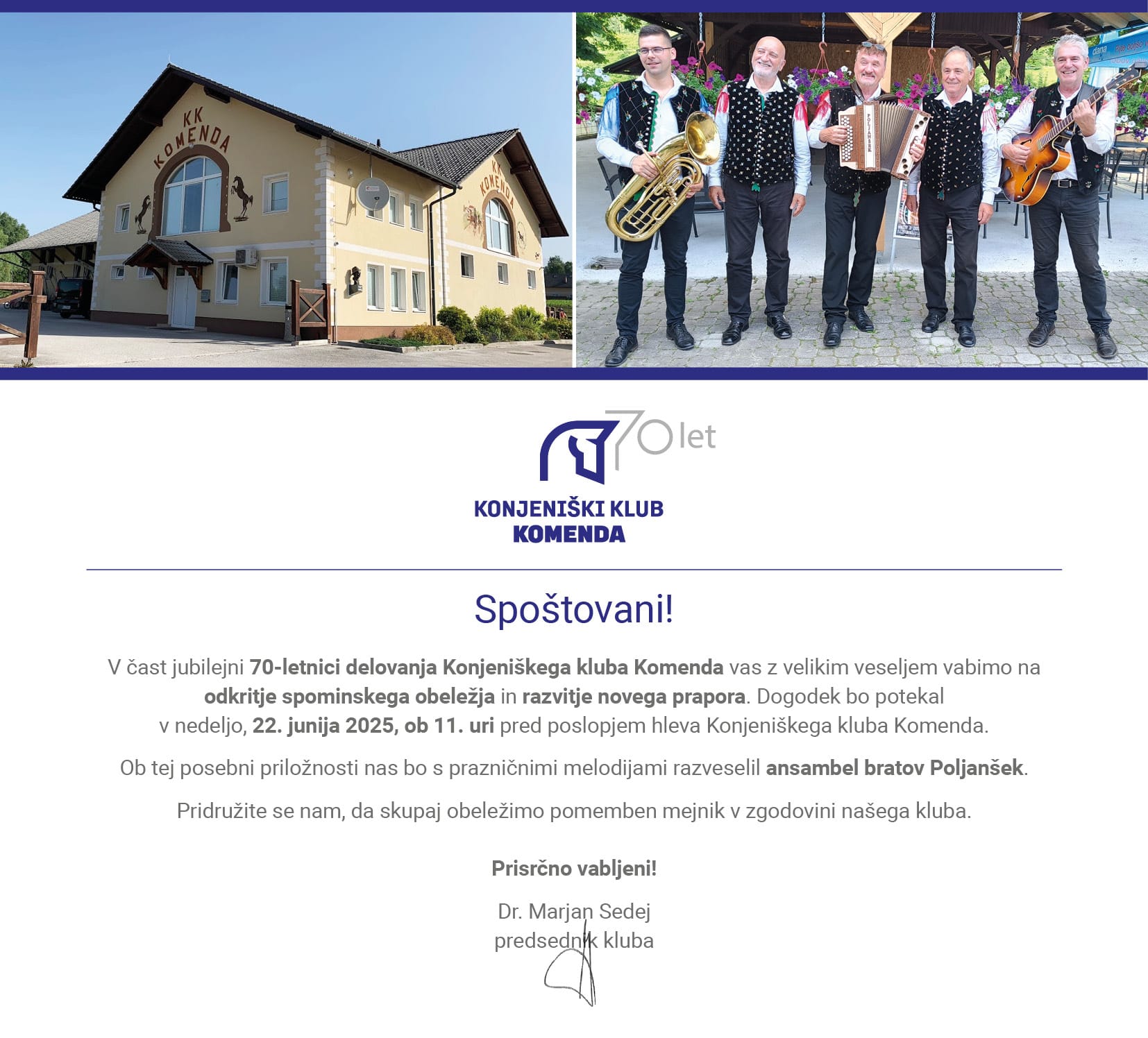 Včeraj, v četrtek, 11. septembra 2025, je Konjeniški klub Komenda v Kulturnem domu Komenda obeležil častitljivo 70-letnico svojega delovanja s slavnostno akademijo, ki je združila prijatelje konjeništva, predstavnike lokalne skupnosti ter državne institucije. Dogodek so počastili številni ugledni gostje, med njimi predsednik Državnega sveta g. Marko Lotrič, poslanec Državnega zbora g. Janez Cigler Kralj ter […]